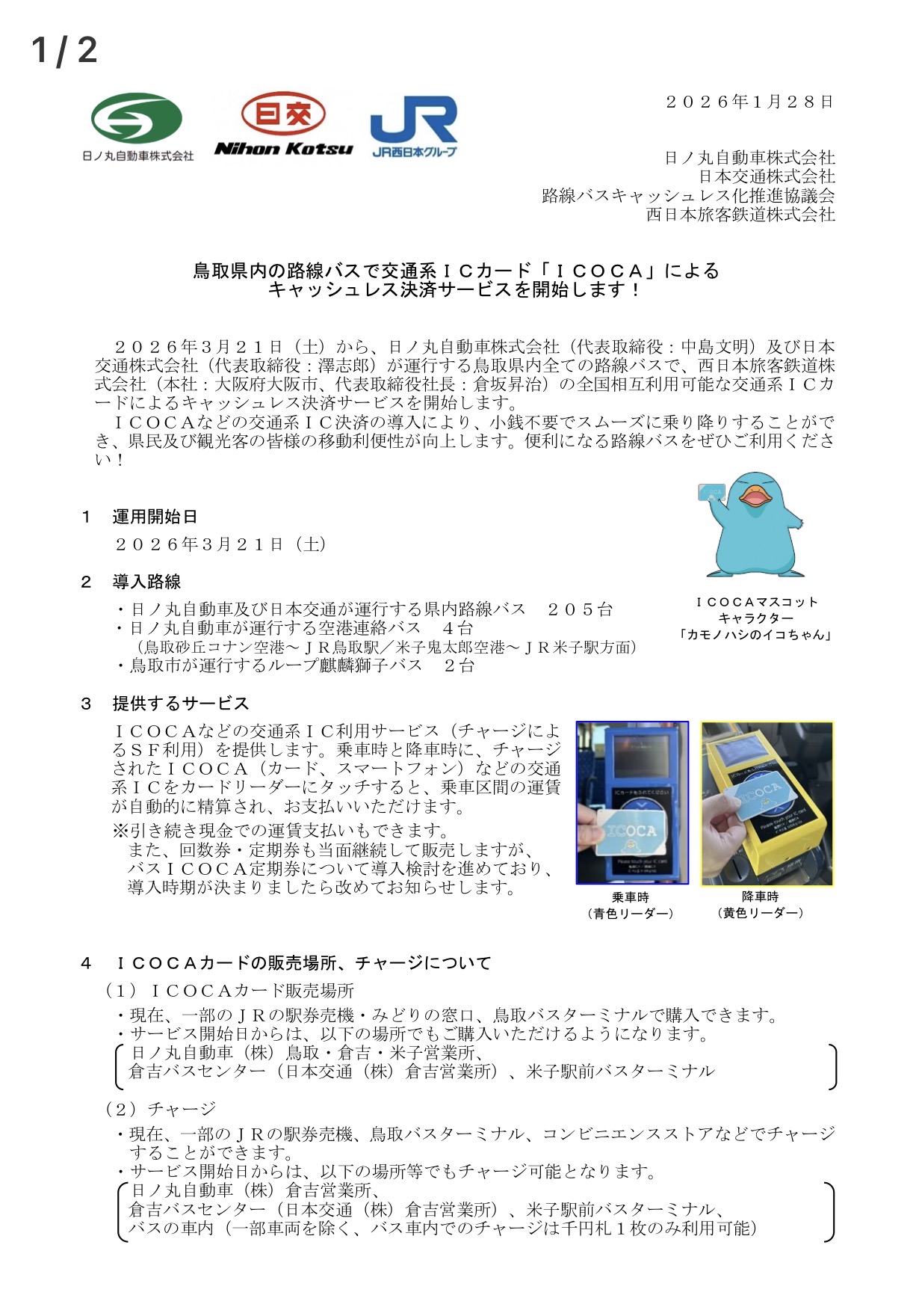 | 鳥取県路線バス、ICOCA利用開始詳細 走る鉄バス 2026.1.28(水) 17:16 | 修正 |
