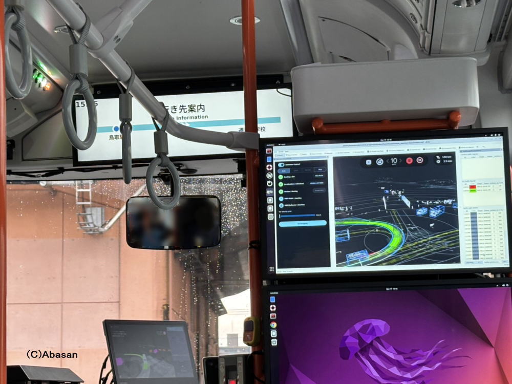 自動運転バスの運転席背後には、運転状況を表示するモニターを設置。