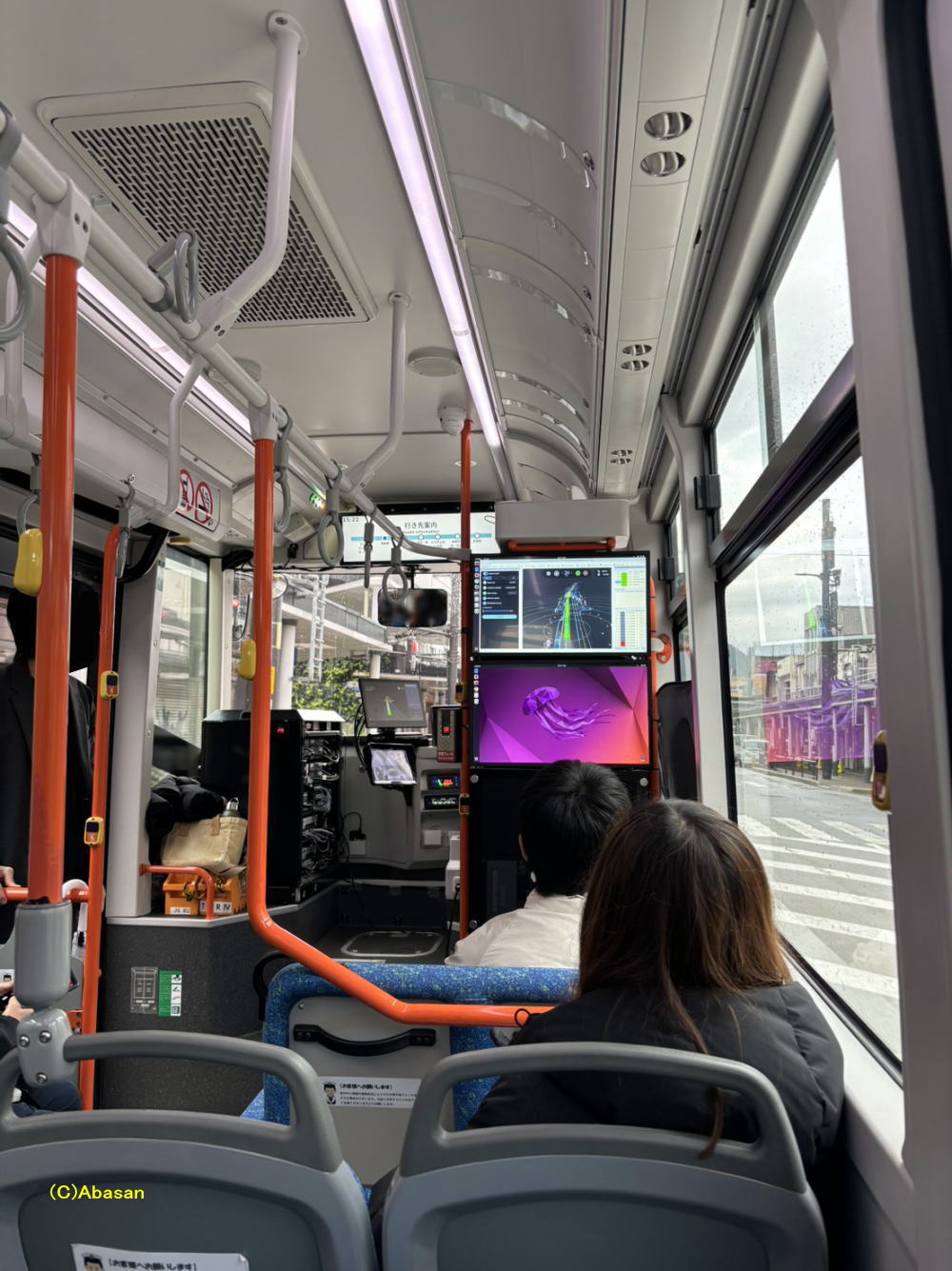 車内には、自動運転バスの開発企業であるティアフォーの社員が同乗。自動運転の説明や乗客からの質問に対応しました。