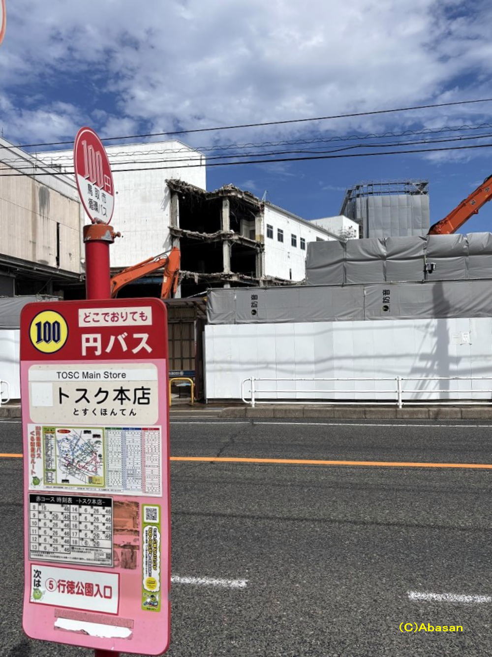 2025年9月、解体は順調に進むも、バス停名は「トスク本店」。