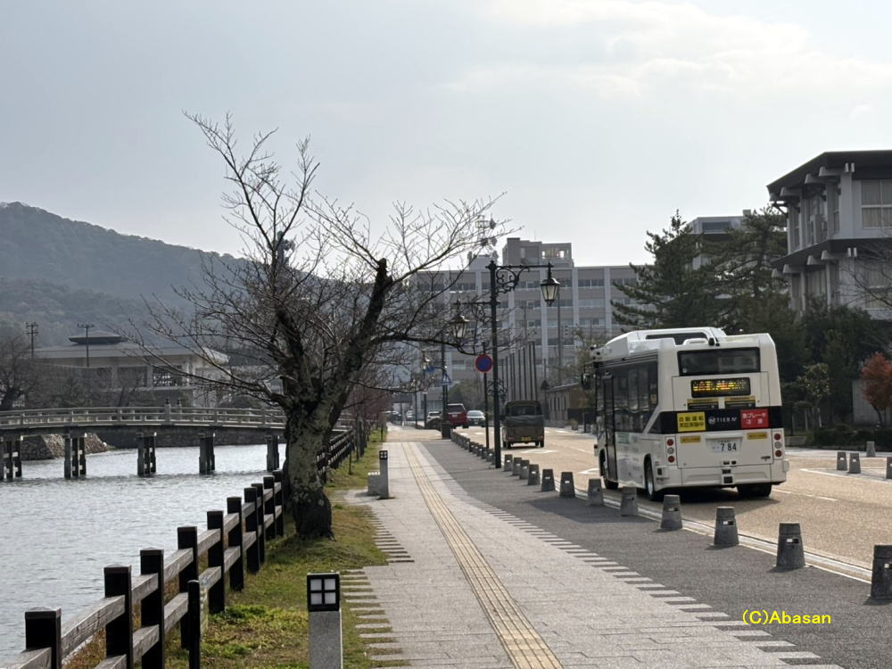 お堀端を行く自動運転バス。