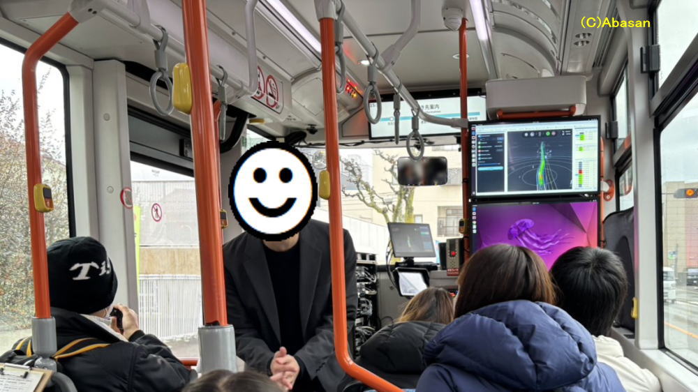 車内には、自動運転バスの開発企業であるティアフォーの社員が同乗。自動運転の説明や乗客からの質問に対応しました。