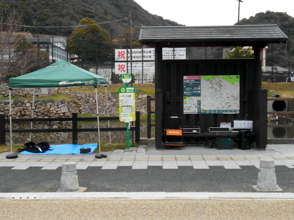 緑コースの「12.市立武道館」停留所では、ランナーを応援する有志がしゃんしゃん傘踊りを披露。停留所周辺には、その為のテントや音響装置が設営されました。